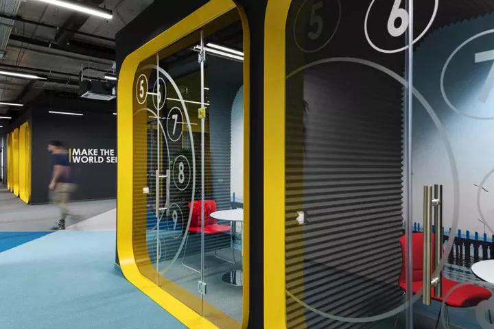 在任何情況下用戶的視覺和聽覺舒適性都是優先考慮的。公司的業務詳情需要高度的私密性,這些都通過各種各樣的飾面得以實現。裝修公司設計團隊為公司創建了一套完整的視覺體系,包括玻璃上的平面圖形、壁紙和墻面圖形等。以企業色制作的墻面和地面圖形,以及根據不同功能和光線而應用的不同透明度的玻璃隔墻和木與黑色金屬制作的隔斷等。