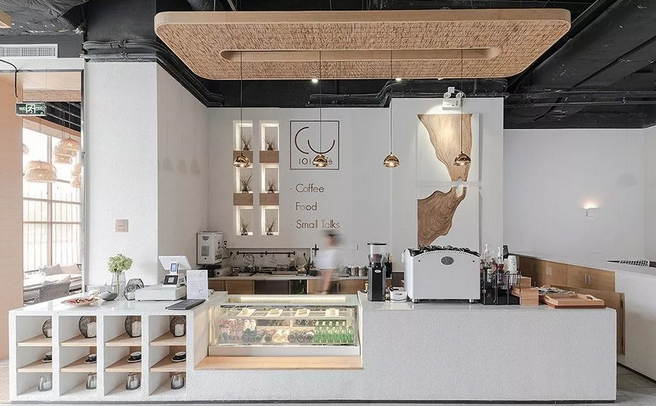 咖啡的店面是狹長型,并且底部的自然光線非常差,因此合理安排空間就成為了一種挑戰。深圳裝飾公司設計師師決定在底部最暗的地方設置一個會客室,通過應用大量的吊燈并以方形的竹子天花作為亮點,最終把最薄弱的地方變成了空間中的亮點。這樣,就可以讓顧客找到一個舒適的地方就座。